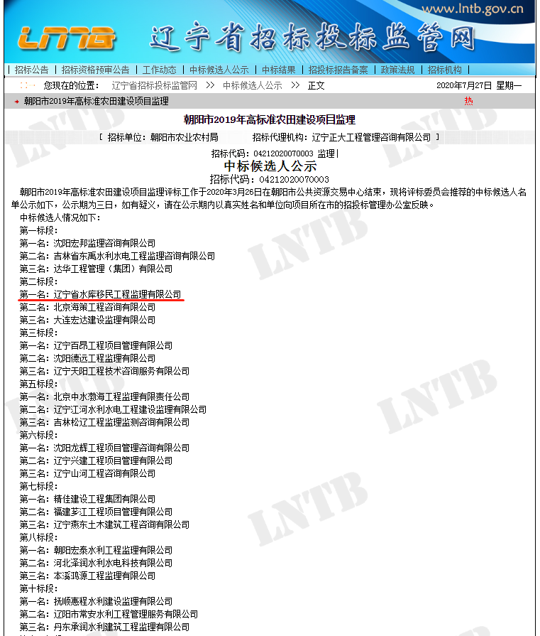 遼寧省水庫(kù)移民公司中標(biāo)朝陽(yáng)市2019年高標(biāo)準(zhǔn)農(nóng)田建設(shè)項(xiàng)目監(jiān)理第二標(biāo)段